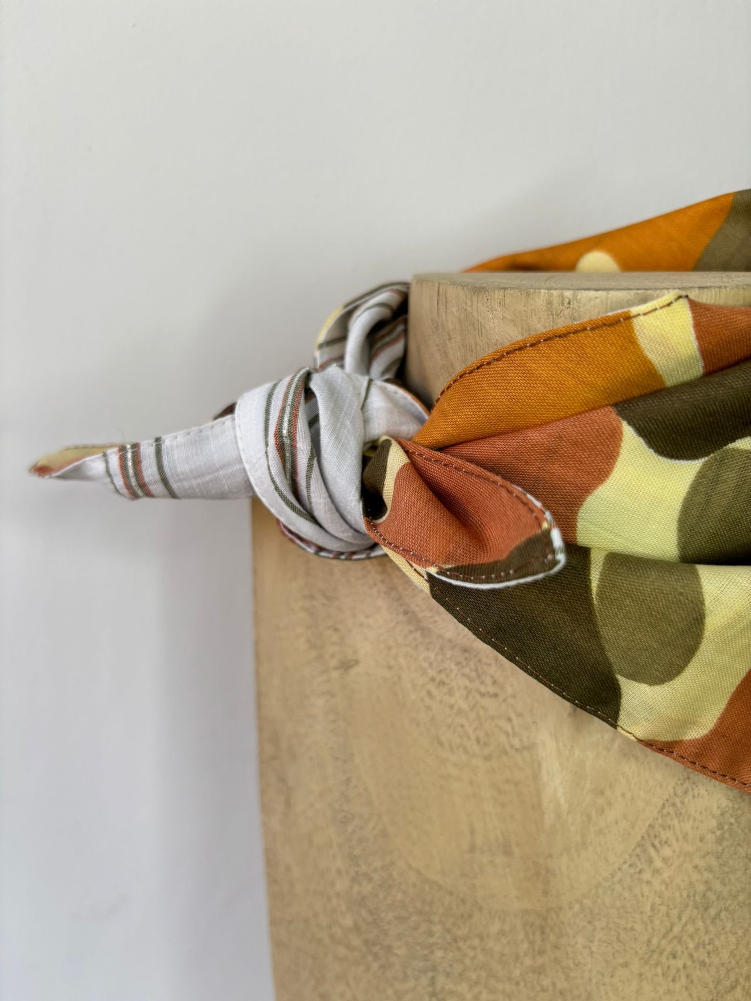 Bandana reversible. Por un lado estampado camuflaje en tonos calabaza y verde caza combinando el reversible en una base blanca con verde caza y lurex dorado. Hecho a mano. Cuidados: Lavar preferiblemente a mano con agua fría, no usar secadora y planchar a baja temperatura