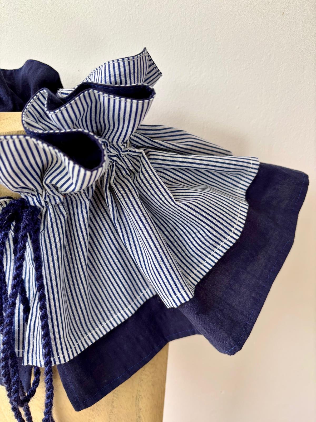 Mini Capa con volante. Base en algodón azul marino y volante de rayas azul marino y blanco. Hecho a mano. Cuidados: Lavar preferiblemente a mano con agua fría, no usar secadora y planchar a baja temperatura